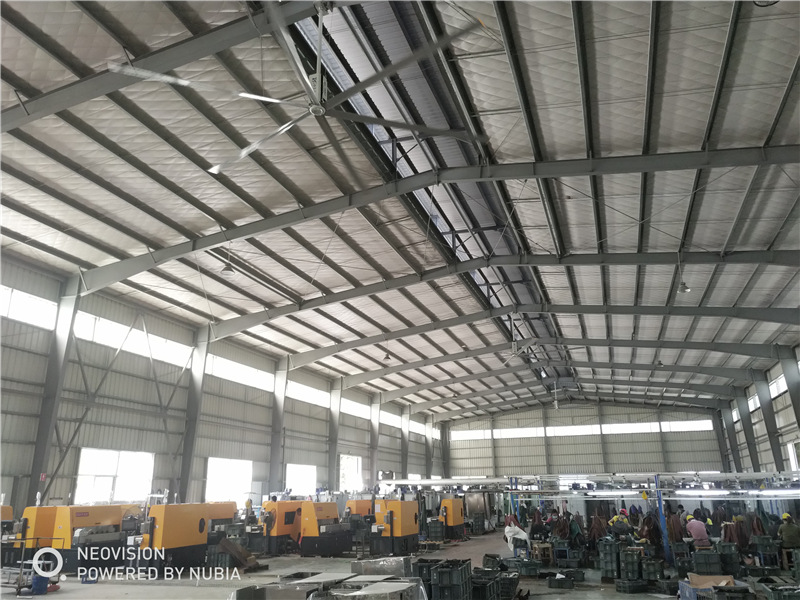 車間面積通常較大,空間高度較高,整個(gè)室內(nèi)的空間體積巨大,室內(nèi)空氣流通不暢,夏季鐵皮屋面因日照吸熱,加之室內(nèi)一般都存在一定的熱源(發(fā)熱設(shè)備),故通常均不同程度存在著生產(chǎn)工作環(huán)境高溫悶熱的問題。而華南地區(qū)熱季周期較長,環(huán)境問題尤為突出,再者,近年來各企業(yè)普遍面臨著招工難、難留人的用工問題困擾,找到良好的廠房車間通風(fēng)降溫解決方案,并進(jìn)行環(huán)境改善,已越來越迫切。 典型的鋼結(jié)構(gòu)廠房車間工業(yè)風(fēng)扇,工業(yè)吊扇大風(fēng)扇通風(fēng)降溫解決方案如下 工業(yè)大型風(fēng)扇供應(yīng)商/大型工業(yè)風(fēng)扇廠家/工業(yè)大風(fēng)扇應(yīng)用領(lǐng)域:
