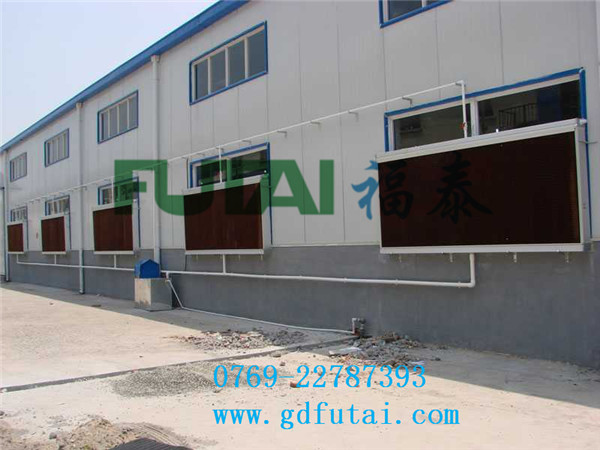 “福泰”濕簾降溫是通過蒸發(fā)降溫的一種經(jīng)濟(jì)的降溫方式。干熱空氣通過水簾進(jìn)入室內(nèi),由于水簾內(nèi)孔壁均勻布滿水膜,這樣室外新鮮空氣穿過水簾時,水簾上的水會吸收空氣中的熱量并產(chǎn)生蒸發(fā)現(xiàn)象,使新鮮空氣溫度下降,濕度增加,完成降溫過程,從而使廠房里的空氣變得涼爽、濕潤。負(fù)壓風(fēng)機(jī)通過自動控制系統(tǒng)實(shí)現(xiàn)風(fēng)機(jī)百葉的自動開啟和關(guān)閉達(dá)到防塵、防水、美觀的效果。噪音低、風(fēng)量大、耗電少、降溫效果明顯;既可吹風(fēng)、也可抽風(fēng),質(zhì)量保證!是廠房等降溫通風(fēng)的最佳選擇。